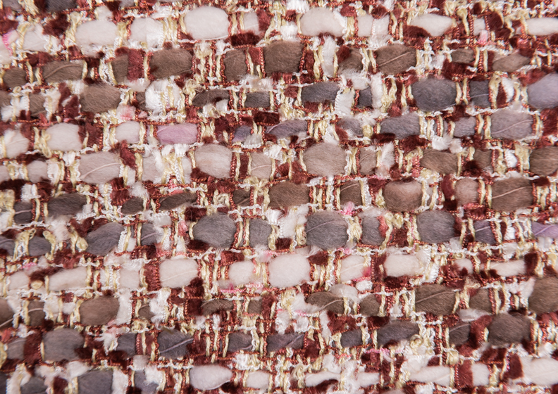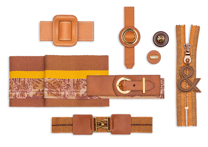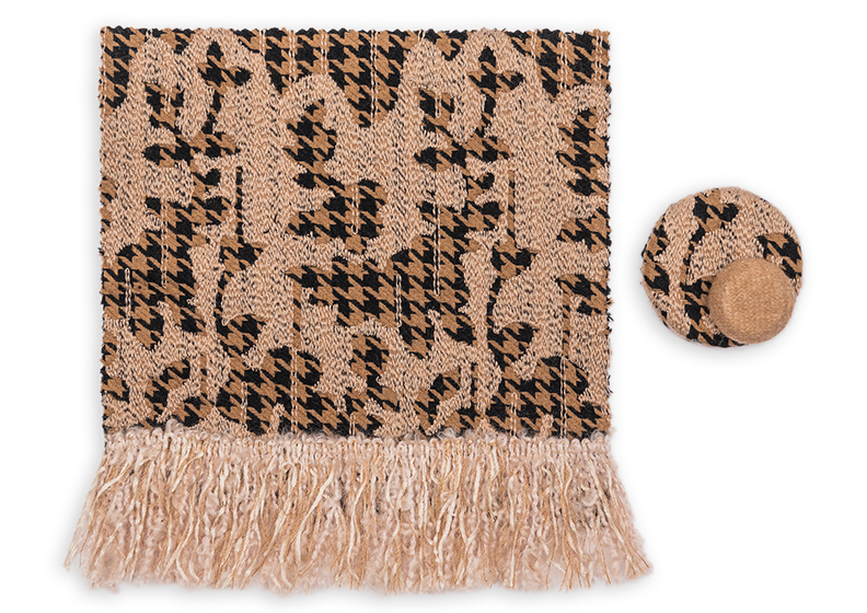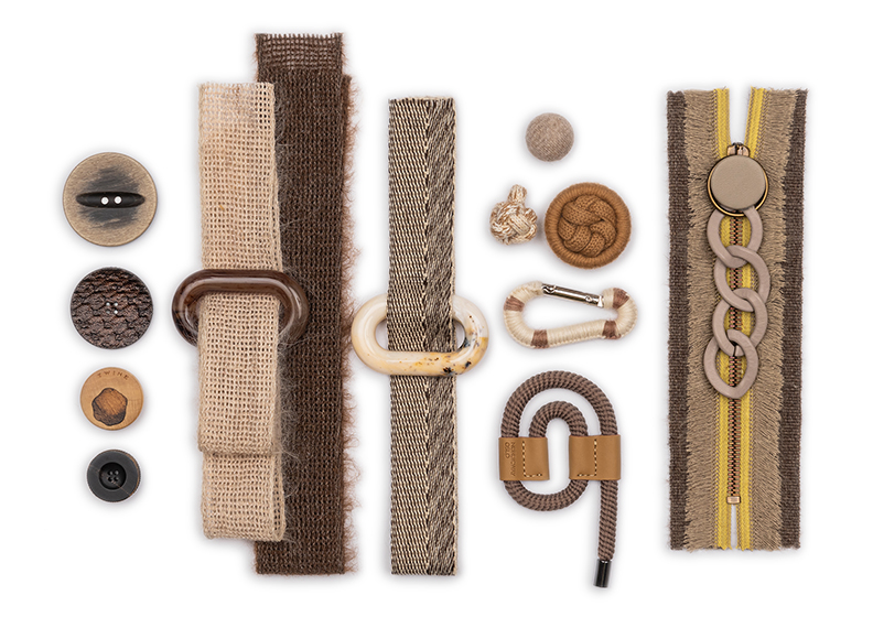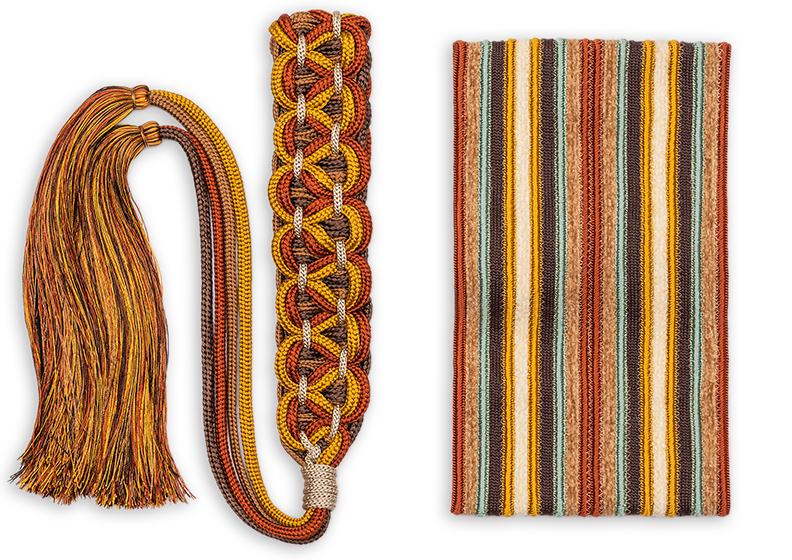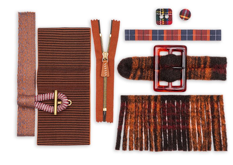 Per gli accessori, le passamanerie sono a bordi alti, realizzati con rigature in mischia di filati lana e ciniglia, grossi intrecci e nappine.
